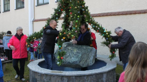 Schon einige Wochen vorher wurde in Ried das Osterbrunnenfest vorbereitet. Die Schüler der Grundschule Ried bemalten dazu Eier und übten einen Tanz ein. Die Mitglieder der Blumen- und Gartenfreunde plünderten ihr Buchsbüsche und flochten daraus in mühevoller Arbeit Girlanden. In einer kleinen Feier konnten dann die Rieder das Ergebnis bewundern. Bürgermeister Erwin Gerstlacher und Mitglieder des Vorstands der Gartler schmückten den Dorfbrunnen mit den kleinen Kunstwerken. Martha Schikorski und ihre Flötengruppe untermalten die Feier musikalisch. Kinder der Jahreszeiten-AG mit ihrer Lehrerin Simone Krohe führten einen Tanz auf. „Schön langsam entsteht schon wieder so etwas wie Tradition“, freute sich Grundschulrektorin Melanie Prager.